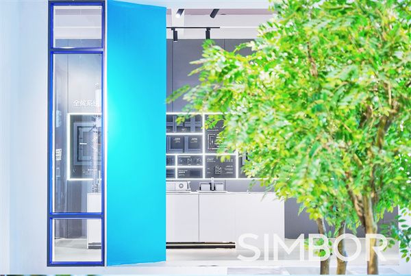 新标门窗展馆,以极致简约的高级渐变灰白黑色系为主色调,辅以亮眼夺目的新标蓝抢占眼球,灰白之间加入一抹抹绿植点缀其中,尽情演绎家居带来的奢适并序,抓住观展者的眼球。