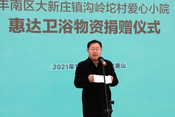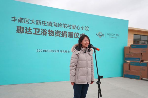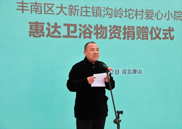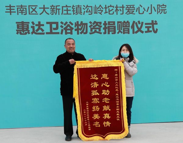 捐赠仪式上,大新庄镇人大主席怀晓伟发表了致辞。唐山市人大代表、惠达常务副总裁王佳向爱心小院捐赠卫生洁具等慈善物资,并讲话。她说:“看到家乡父老的生活有所改善,我感到特别自豪。感谢郭俊章同志长期以来对公益事业的支持,作为从唐山丰南走出的民族卫浴代表,本次爱心小院捐赠活动于惠达而言,既是惠达一直坚持的公益之举,更是对家乡父老的感恩回报。希望我们提供的卫浴洁具产品,能够为老人们营造一个更舒适的生活环境,为解决沟岭坨村的养老居住问题略尽薄力。”