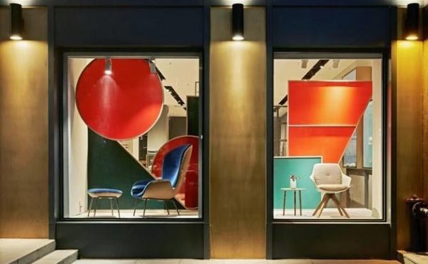 绿色,时尚圈近年流行色,红色,亦呈现古典精致感。当红绿色,搭配包豪斯几何元素,为空间增添难以模仿的神秘气质。设计师一改沉闷的命名风格,以几何图形与家居组合成品牌名「字母」,让橱窗空间暗藏注脚。