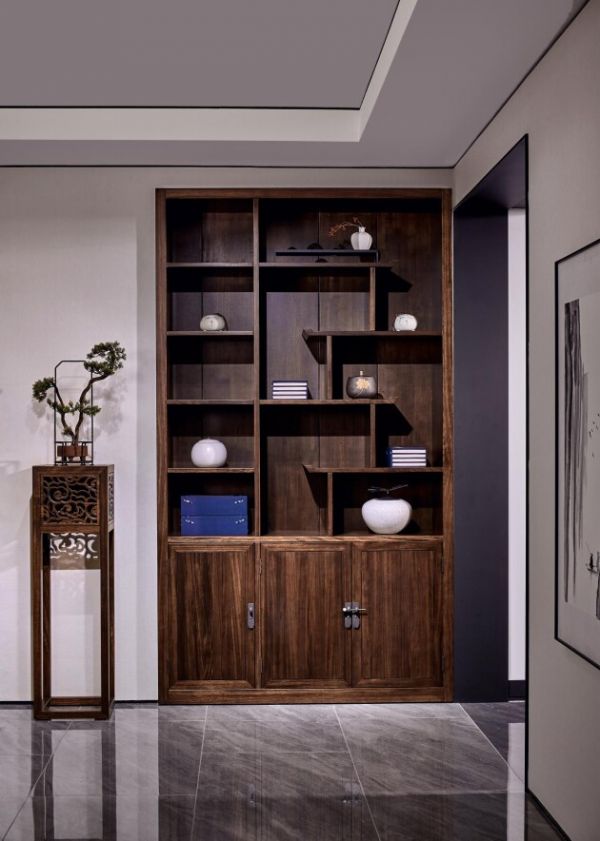博古之意即为“通晓古事古物”,在典雅庄重、精致奇妙的中式家具系列里,博古架属于中式设计书房,客厅中可陈设古玩瓷器等珍宝的一类家具,既有实用功能,又突显中式空间的装饰美学。书檀设计师在深入理解宋式家具的造型、装饰、意境的人文内涵基础之上,融合现代极简设计风格,既具中国传统家具的意境,又不失时尚感。曲直之间,尽显中式文化的韵律。