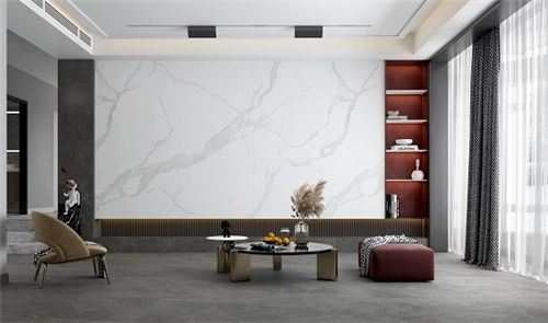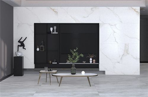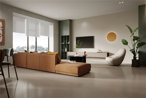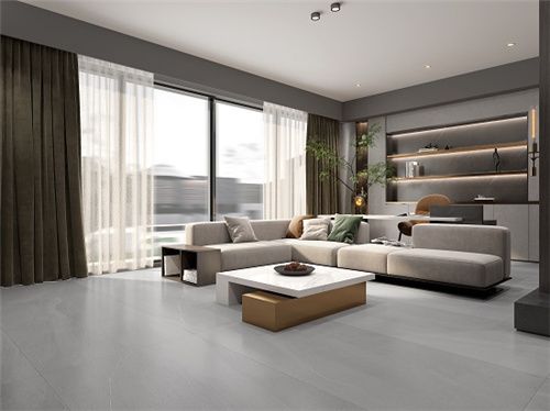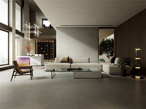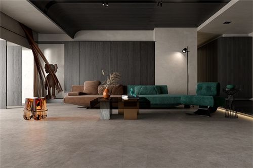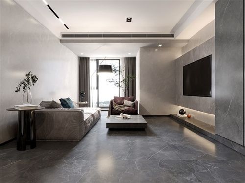 比如灰色系的箭牌复合轻纹砖搭配。灰色作为经典的配色之一,介于黑白中间,不像黑色和白色那么纯粹,但却具有沉稳、低调的特点,在客厅中使用最不容易出错,更能够凸显空间的高级感。