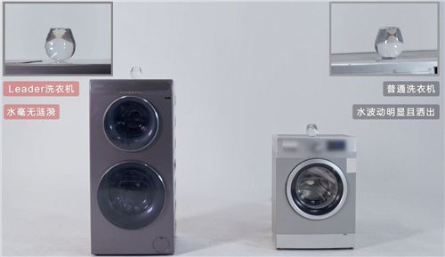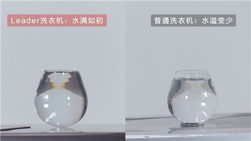 视频显示,实验人员将同等容量的两杯水分别放置在两台洗衣机上,分别是普通滚筒和一台上下双筒的Leader洗衣机。当两台洗衣机启动工作时,旁边放大的视频画面可以看到,普通洗衣机上的水杯一直在晃动,水也不断洒出;而Leader洗衣机上的水杯丝毫不动。结果显示,前者杯中水明显变少,后者水满如初。
