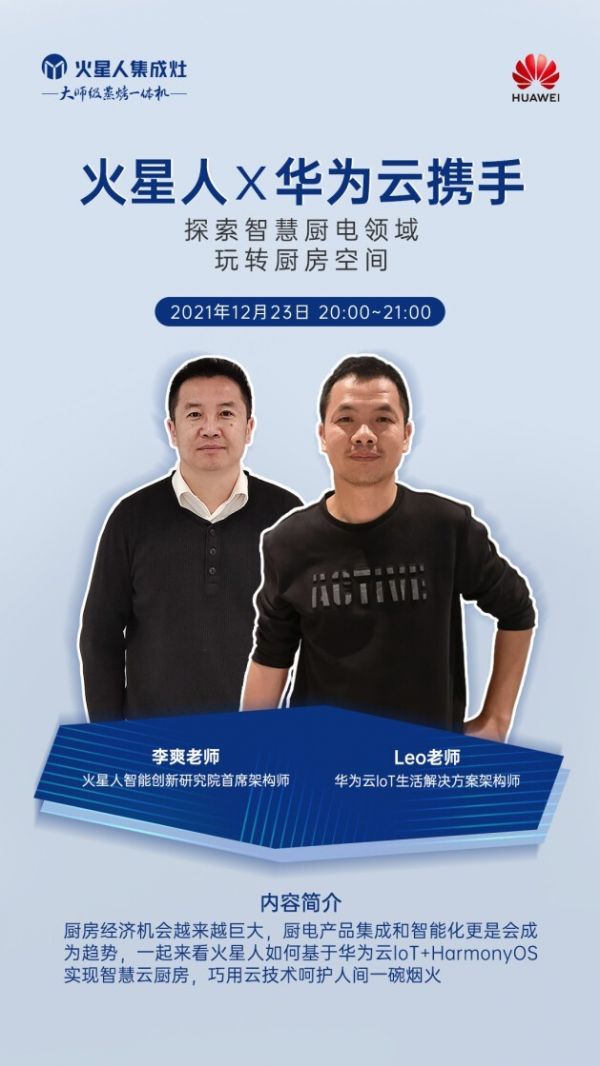 此番火星人与华为云IoT携手合作,为“以点带面促进行业全面升级”树立优秀标杆。相信未来,与行业龙头火星人更加深入的合作积极展开,在华为云IoT和HarmonyOS生态的加持之下,集成灶行业的数字化智能升级进程还将进一步提速。
