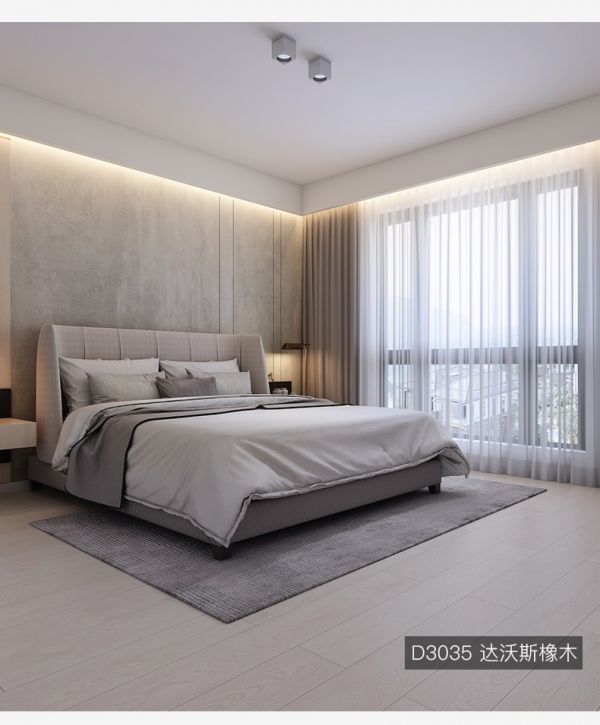 黑、白、灰是北欧风格空间常用的颜色。其实黑白灰属于相对百搭的颜色,在很多风格的空间中都能找到它们的身影。在北欧空间效果中它们更是当之无愧的王者,常常当做主色调来进行装饰。尤其是白色与亮度较高的灰,很容易就搭配出清爽明快的空间效果。在这样的空间中可以选用浅灰色系的地板,既符合整体空间的色调,作为地面来说又显得沉稳大气,大大提升时尚度。由于北欧风格在造型上相对简洁,所以如果要空间更显质感,更要注意装饰物的品质感。卢森地板除了颜色与空间和谐,它的地板花纹也来自真实原木的剖面,所以整体看上去花纹流畅自然,这也恰到好处地符合了北欧空间崇尚自然、简洁的内核。