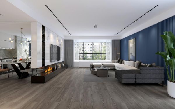 北欧风格简约却不简单,看似无意却深含巧思的搭配往往让人印象深刻,空间中总有让人眼前一亮的视觉中心。由于北欧风格不喜复杂夸张的造型,所以这种整体空间中凸显的视觉中心往往用颜色来形成跳跃感。比如上图中虽然还是白色、灰色的经典组合搭配,但是设计师巧妙的用大面积蓝色块来装饰墙面,对空间的功能性进行了巧妙的分割,又大大提升了空间的自由度与时尚感。会客区也是同样的道理,在两组灰色大沙发映衬下,豆沙红色的单椅格外引人注目,让稳定的空间形成了更丰富的视觉效果。空间有大面积色块的情况下,地板的选择要格外注意。颜色方面,卢森地板雪朗橡木属于灰调中偏暖的地板,选择灰调地板这与空间整体氛围保持一致,同时偏暖的视觉感受又符合我们对“家”的定义。