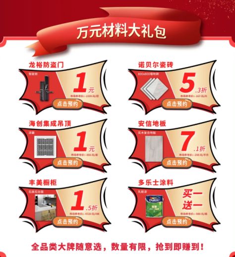 同时,百姓装潢携国内外大牌建材战略合作伙伴,为报名参加本次展会的客户精选了万元材料优惠大礼包。签约就送龙裕防盗门智能锁1元秒杀,海创集成吊顶1元限量购,诺贝尔瓷砖5.3折,更有大牌多乐士涂料买一送一,此外还有百姓装潢众多战略合作伙伴,都将出席展会并推出全屋装修材料和家装用品超值放送活动,全品类大牌随意选,开启年度任性家装狂欢。