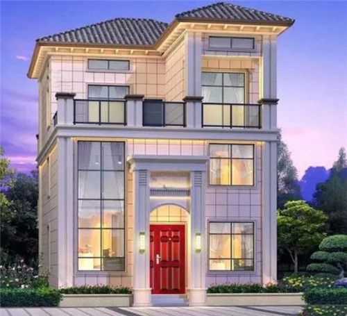 这是一款欧式三层小面宽房屋,外观以乳白真石漆为主色调,再配上红色的入户门、灰色的屋顶,则可以将欧式的大气、时尚体现到极致。而大落地窗设计,则既好看,又可以增加室内的采光和通风。