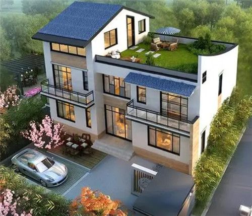 这款房屋看起来非常的舒服,外墙立面以白色真石漆为主,再配上蓝色的屋顶,既简约时尚,又能给人眼球一亮的视觉感。而大露台空中花园设计,则可以大大提高业主的生活品质。