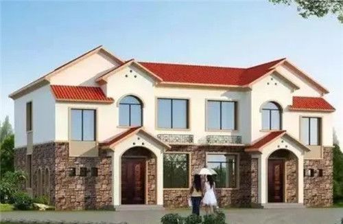 这是一款简欧风格的双拼别墅,外墙立面采用最经典的色调进行搭配。再配上底层的文化石和顶层的红色屋顶,则可以让房屋色彩更加丰富。