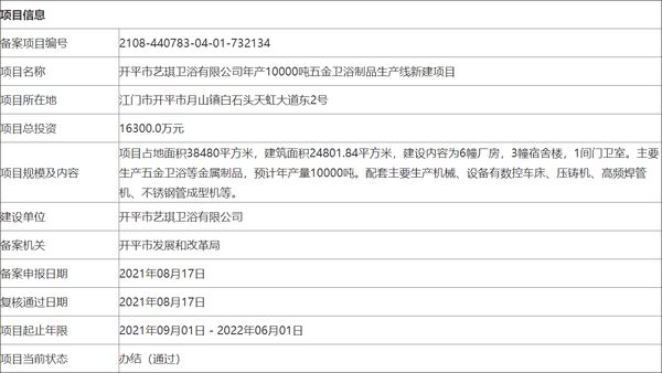 12月23日上午,开平市2021年第四季度重大项目集中动工(投产)活动拉开帷幕,动工(投产)项目8个,签约项目6个,总投资额达67.06亿元。其中,开平市艺琪卫浴有限公司五金卫浴制品生产线新建项目总投资1.63亿元,项目建设地位于开平市月山镇白石头天虹大道东2号,是低效地块再利用项目。项目用地57.7亩,建筑面积24801.84平方米。项目建成后,预计年产值2亿元,年创税900万元。