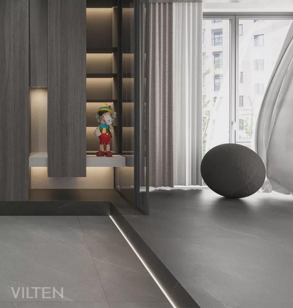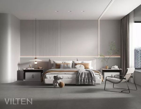 威尔顿瓷砖“愫”低光素色系列,始终尊重万物谐和,卧室轻漾的灯光与自然光相互谐和,从不同的角度发散出来,与理石的质感一起描摹出空间起伏的轮廓,让人可以静下来触摸丰富、柔软的心。