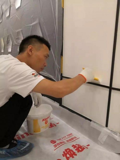 4、专业涂刷。工作人员使用阿尔贝娜乳胶漆以及专业的德式涂装工艺进行涂刷;