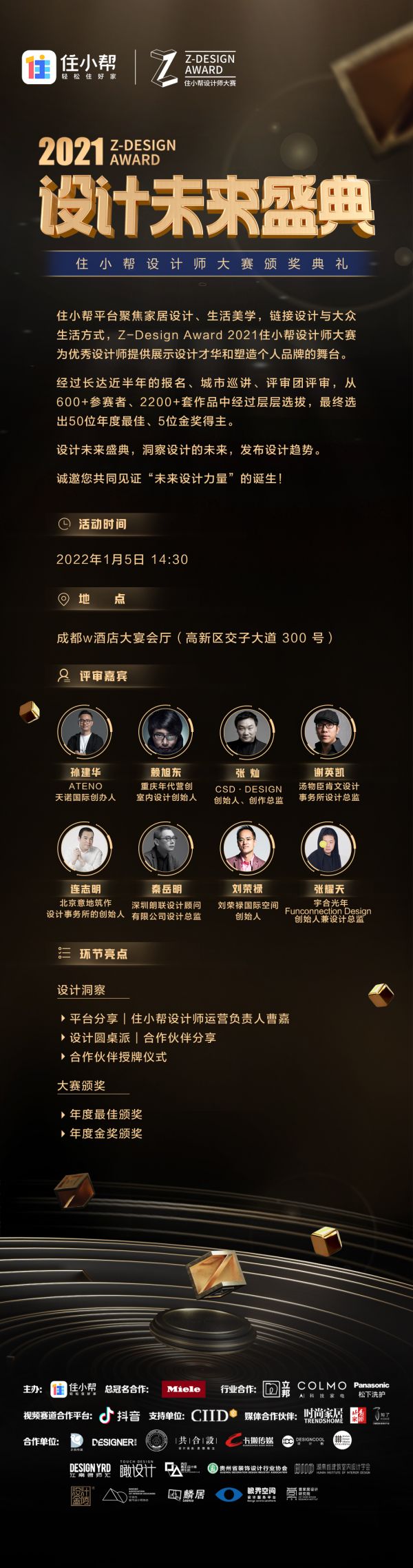 带着对上述问题的思考,1月5日,住小帮与德国美诺Miele一道,携手众多设计领域的资深人士、新锐力量,齐聚首届住小帮设计师大赛颁奖典礼——2021 Z-Design Award设计未来盛典,一起见证设计新势力的崛起,探索设计领域的前行之路。