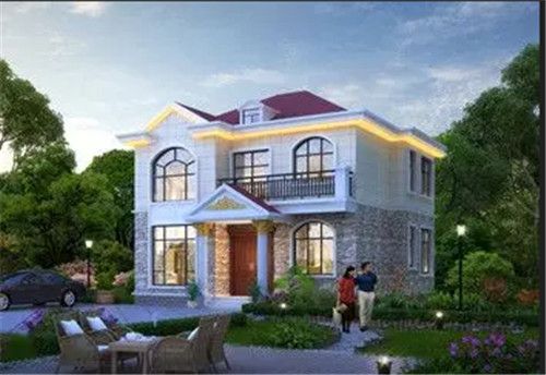 这是一款简欧风格的房屋,一层采用棕色外墙砖,凹凸有致,凸显个性。二层和门前柱子采用米白色真石漆,再配上屋顶采用红色屋面瓦,颜色搭配合理,上下对比鲜明,视觉效果极好。左面拱形落地窗,可以增加室内通风和采光,让业主居住起来更加舒适。