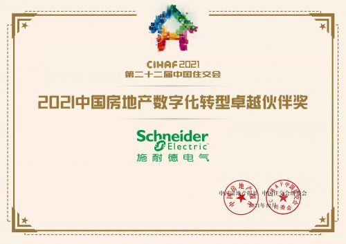 中国北京,2021年12月27日——日前,由《中国房地产报》、中国城市与区域治理研究院、中国住交会联合主办的“中国房地产行业趋势展望暨CIHAF2021第二十二届中国住交会”于北京成功召开,众多政商学界精英齐聚一堂,共商大变局下中国房地产行业的长期发展之道。凭借深厚的地产行业实践经验、先进的数字化技术能力以及多元的数字化产品组合和服务,施耐德电气在此次大会上获颁“2021中国房地产数字化转型卓越伙伴奖”,并位居“2021中国绿色建筑优选供应商”智能家居/可视对讲类别TOP10榜首。