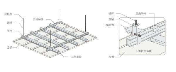 1.方形天花板 2.三角龙骨 3.三角龙骨吊件 4.轻钢主龙骨 5.轻钢主龙骨吊件 6.吊杆 7.修边条 8.拉爆头