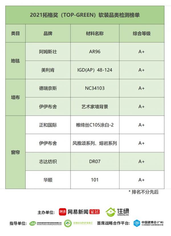 2021拓格奖 | 软装品类测评榜单公布:9款软装产品达到最高环保A+等级