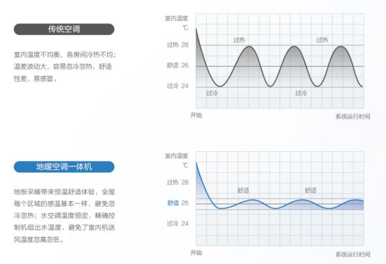 相对于传统空调制冷采暖时室内温度波动大,冷热不均,忽冷忽热,地暖空调一体机能实现室内精准温控±0.5℃,小温差大健康,杜绝忽冷忽热;室内空间温度均衡,不会出现各房间冷热不均。温室级的恒温恒湿控制技术,为肌肤带来鲜花般呵护,让您尽享温柔的清爽和贴心的温暖。