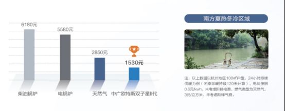 (2)南方夏热冬冷地区,以杭州地区100㎡标准户型为例,冬季采暖持续120天,24小时持续供暖计算,传统电锅炉采暖方式一个采暖季大概花费五千多,而中广欧特斯带地暖的中央空调只需约1530元,无惧电费压力,让地暖装的起更能用的起。