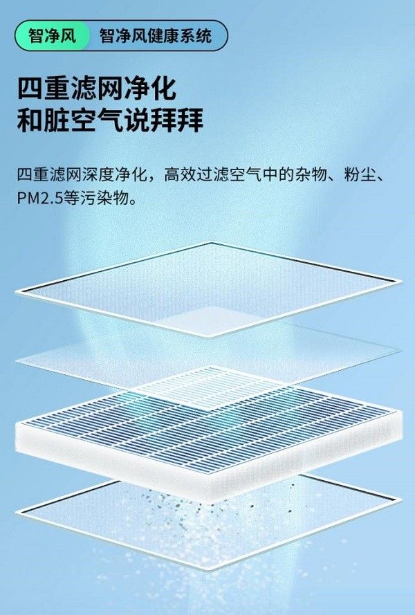 TCL新风空调小蓝翼II具备智净风功能,能通过四重净化滤网有效过滤PM2.5、粉尘颗粒,还能抗菌抗病毒,加上56°高温除菌自清洁功能,和脏空气说拜拜,把层层精选的好空气送到用户身边,保证每一口呼吸都健康洁净。