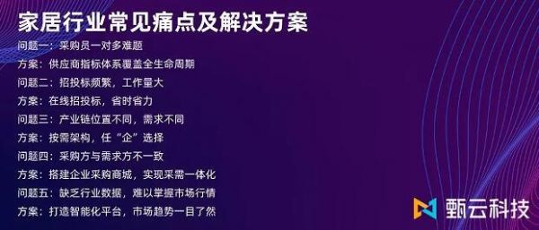 甄云科技在数字化采购领域深耕16年,先后为数十家家居企业提供数字化采购解决方案,在助力企业降本增效的同时,也积累了丰富的经验,并推出了针对家居领域各个痛点的行业解决方案。