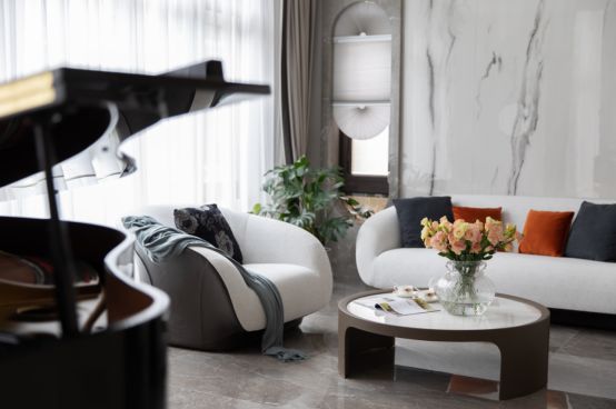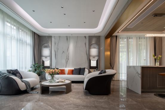 客厅采用浅咖瓷砖地板,高级质感中体现一丝温暖。黑白相间的沙发配爱马仕橙和极致灰的抱枕,搭配简单纹路的大板背景墙,加上植物与鲜花用来增添生气,整个空间浪漫又不失优雅。