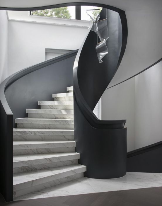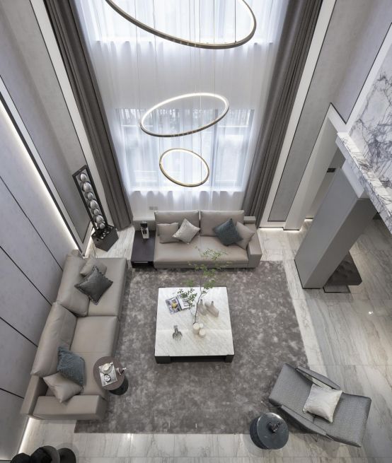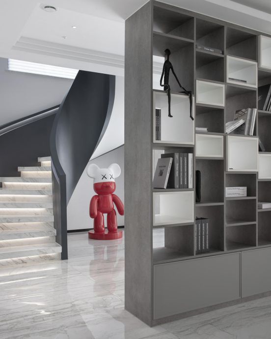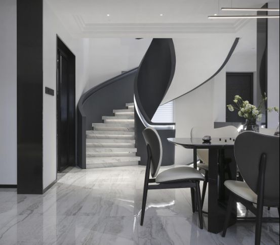 本案是位于上海嘉定的一套独栋别墅,设计之初就有把功能重新解构重组;通过把原有楼梯墙体通通拆掉之后,赋予了全新的空间及功能,超长的门厅与客厅比邻,通过两根承重柱的装饰使空间敞亮又有相对的私密性。改造后的空间南北轴线串联着客厅,餐厅,楼梯厅,还有二楼的起居室,旋转楼梯至上而下,让空间的气流,光线最大限度的呈现出来。