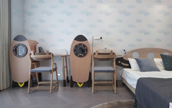 儿童房的床品和桌子选择了设计感十分可爱而简约的原木色,就像积木拼图,可爱中有质感。搭配浅蓝的云朵壁纸,童真且梦幻。