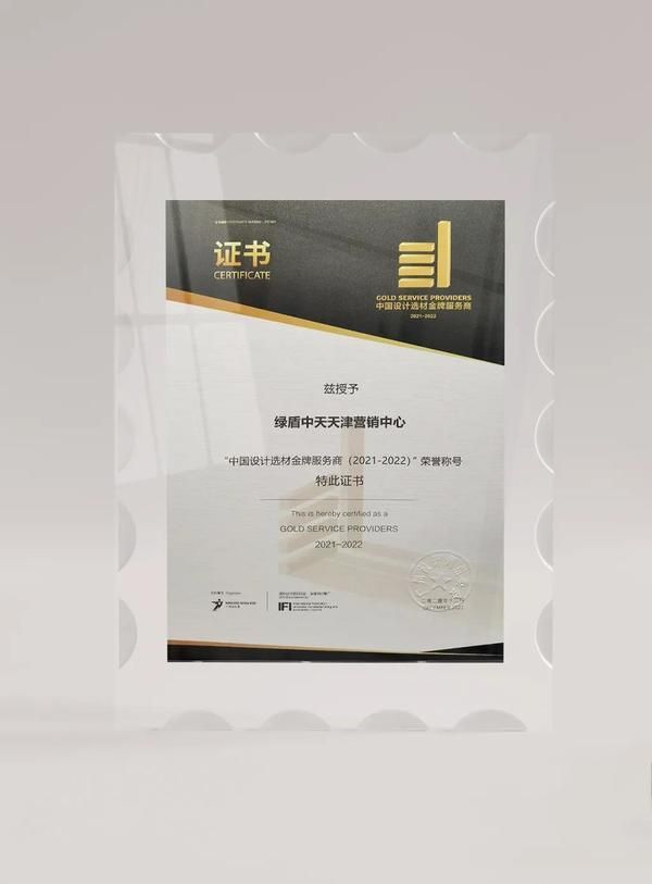 近日,2021年度“中国设计选材金牌服务商”百强颁奖典礼在广州设计周隆重举行,本次颁奖典礼公布了年度“中国设计选材金牌服务商”上榜名单,绿盾中天兰州、天津服务商表现优异,荣誉登榜!