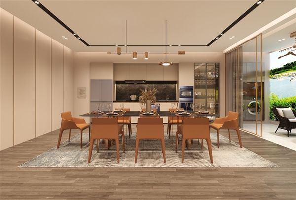 在客厅区域,从归家前奏、温馨回家、沉浸观影、休闲会客、派对模式到安心离家等模式,从下班回家到出门工作的整个过程,摄像头、台灯、窗帘、新风机、空调、扫地机器人等在智慧主机控制下协同联动,满足观影、会客、派对等场景需求。
