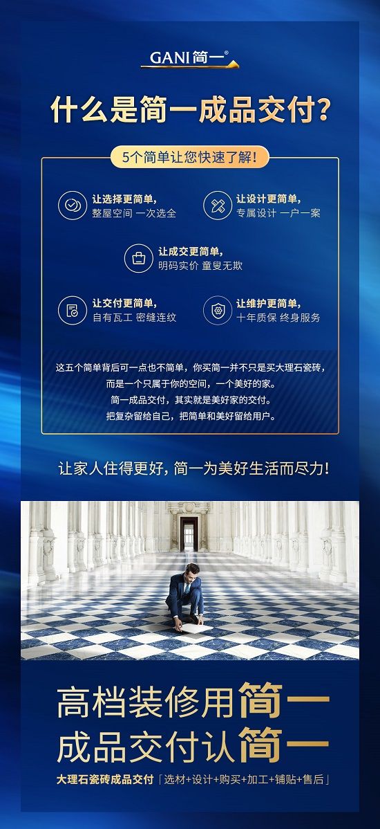 围绕「人的需求」为核心,通过产品技术、加工技术、铺贴技术、运营体系的搭建,简一把复杂且耗时的家装工程交由自己来解决,把简单和美好留给客户。从消费者端来说,把家装交由专业的人来负责,自己不用请假监工、不用担心工人技术不过关、不用怕产品出问题多方相互推诿,享受到的是一个省心、开心、放心和暖心的家装体验。成品交付是简一系统创新的又一重大成果,其颠覆了瓷砖行业因惯性思维而形成的产品交付模式,是预见行业未来、对行业内在价值观的一次深刻变革。