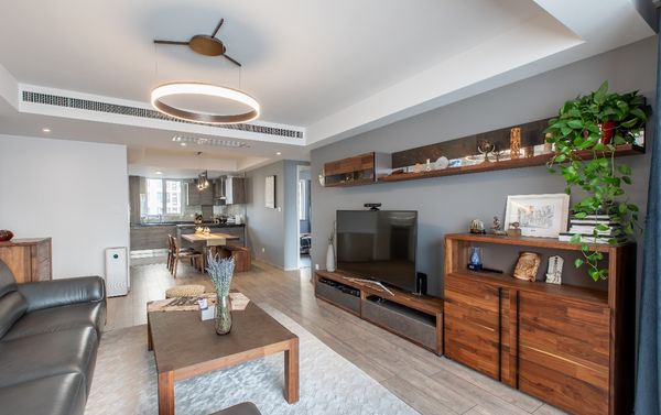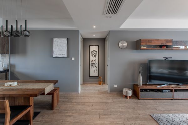 玄关端景搭配创意字画,第一眼就很惊艳;地面采用木质地板,配合深灰色的墙面,奢华中又不失生活的品质。