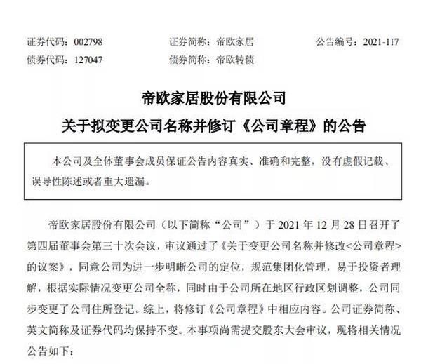 12 月 29日,帝欧家居股份有限公司(旗下拥有知名瓷砖品牌“欧神诺瓷砖”)发布关于拟变更公司名称并修订《公司章程》的公告。公司全称由“帝欧家居股份有限公司”变更为“帝欧家居集团股份有限公司”。