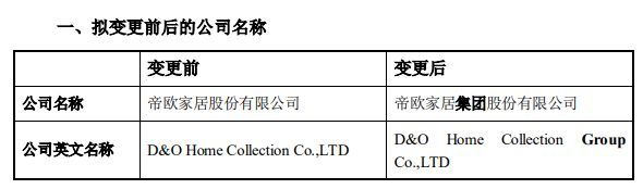 12月29日,帝欧家居股份有限公司(以下简称:帝欧家居)发布关于拟变更公司名称并修订《公司章程》的公告,公司全称由“帝欧家居股份有限公司”变更为“帝欧家居集团股份有限公司”。