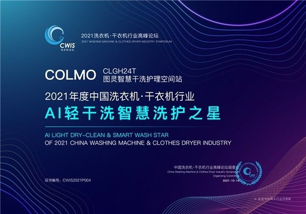 通过将AI核心科技融于高端家电,COLMO真正实现了产品与产品、产品与人之间的“无形”互联,营造出属于未来式家居洗护生活。也正因如此,COLMO TURING干洗护理空间站一举斩获2021中国洗衣机·干衣机行业高峰论坛所颁发的“AI轻干洗智慧洗护之星”奖项。