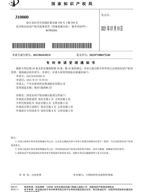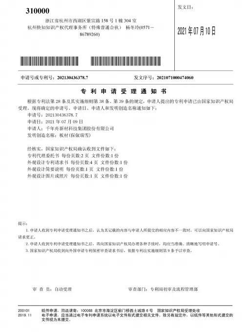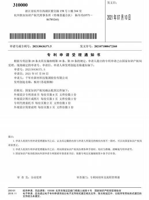 该系列之“苏堤烟柳”、“保俶瑞雪”、“凝湖秋月”、“醉曲风荷”等花色目前正在专利申请受理中,以便及时对知识产权进行保护。早在2007年,千年舟就开始有专利意识并申报第一项专利,截至目前申请专利达100余项,在行业中处于领先水平。