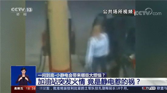 2020年12月,在加油站,一女子整理衣服后把手伸向油枪,因为带有静电油箱口突然燃起大火。