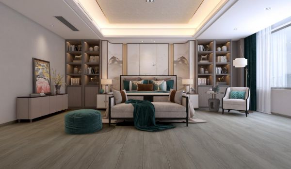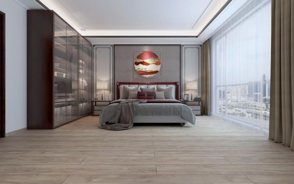 新中式的空间风格不是简单的传统符号的堆砌,而是设计师根据主人的个性化需求把中式传统的雅致和现代居室巧妙相融,使其既能符合现代人的居住体验又能彰显出中式的含蓄高雅之美。我们中国人对红色有着不同的情感。古人认为烈日如火,其色赤红,日出而万物生。所以我们传统的室内很多采用深沉浓烈的红来装饰,以此来体现主人的端庄和内涵。在现代空间中,我们一般不会大面积地使用红色来装饰,但可以局部点缀。这样整体空间有了视觉重点,也符合我们中国人对红色的特殊情感。家具选用了传统红木和灰色软包结合的床体,设计者的思维逻辑很清晰——彰显中式的内涵又符合现代的居住体验!这样的空间中选用什么样式的地板合适呢?设计师精心选择了卢森地板莱克斯橡木。莱克斯橡木拥有自然柔和的颜色,完全符合卧室空间雅致静谧的气质。灵感来源于天然原木剖面的地板花纹,清晰、流畅,这也符合我们人与自然共生的内核。