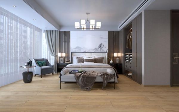 高级灰是近几年家居界比较流行的颜色,克制、冷静的颜色自带高级属性。高级灰被用于很多风格的空间之中,比如现代简约、北欧风、工业风等。现在颇有想法的设计师把高级灰也应用在新中式的空间之中。现代感十足的灰色让整体空间更具现代的时尚度。造型古朴、材质则是现代的,房间的吊灯本身就是传统中式现代运用的典范。气韵生动的山水画展现出自然美景的清幽淡雅。对卧室空间来说,温暖安静的舒适感十分重要。空间主题颜色是灰色,地面就巧妙的搭配了更温柔自然的原木色系的地板。卢森地板冰谷橡木优雅的肌理感线条和有格调的配色,十分符合现代的审美和功能性需求。当代系列定义正在书写历史的现代生活。
