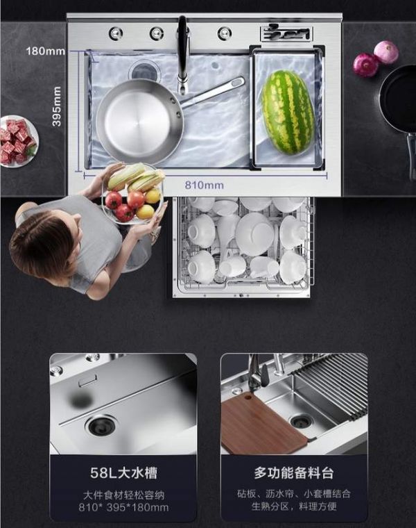 美的中式灭菌集成水槽洗碗机XQ02由多功能58L大容量水槽、10套嵌入式洗碗机、同时可选配净水器、垃圾处理器组合,为用户提供全套洗净消储方案,有效节省900mm的橱柜空间,让你在方寸之间也能为家人准备美味大餐。