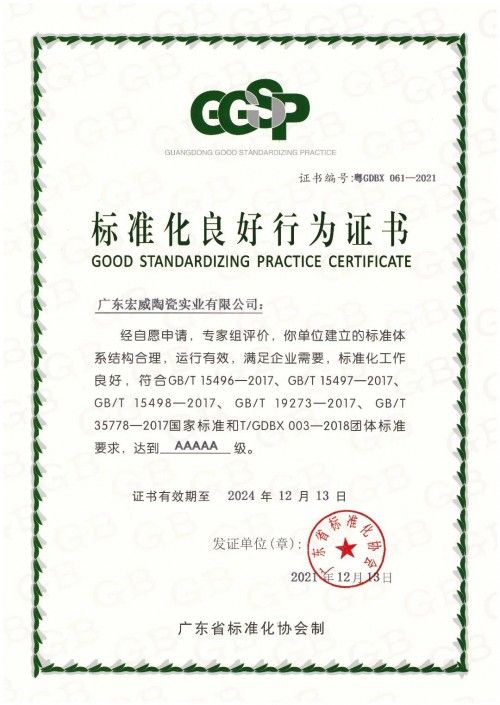 2021年12月13日,威尔斯陶瓷所属的广东宏威陶瓷实业有限公司再次通过由广东省标准化协会颁发的“标准化良好行为AAAAA级企业”复审评定。据了解,该项荣誉是“标准化良好行为”评定中的最高级别,标志着威尔斯陶瓷标准化之路又迈上了一个新台阶!