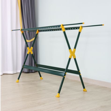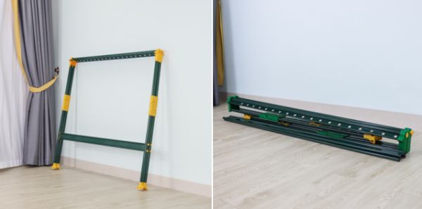 然后,我们考虑到收纳问题,伟经晒衣架整个骨架采用X式折叠,不用的时候可以随时收合,我们开发了两种收纳方式,一种是半收合式,可以立在墙边;另外一种是完全收合状态,收合之后体积152cm*13cm*19cm ,即使是家具缝隙也可以放入。