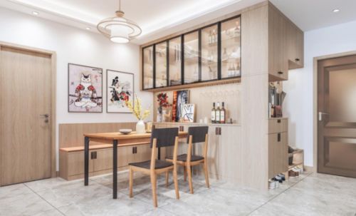 入户和餐厅连在一起的户型可以试试在入户处打造“L型”入户餐边一体柜,以转角区分二者功能,在不浪费每一平米墙面的同时,风格又和谐统一,避免了柜体配色困扰。