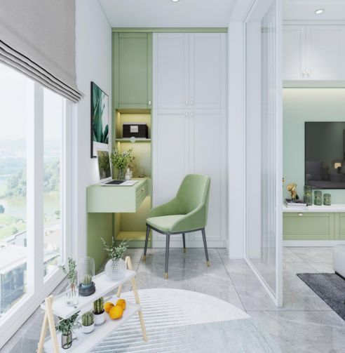阳台一侧定制顶天立式储物柜用来收纳,再从中延展出一个工作台,将隔断门一关,就能成为一个独立的办公区,阳台视野宽阔,工作闲暇举目远眺,还可放松身心。