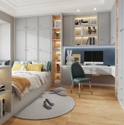 这种“功能三合一”的设计被广泛运用在儿童房或多功能房,它可以同时满足休息、学习和收纳需求,实用且美观。