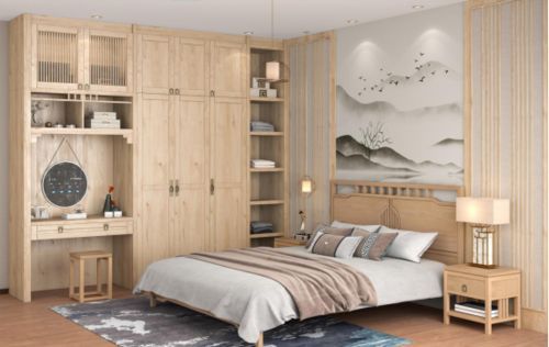 卧室定制到顶式衣柜,大气简约,储物丰富。在转角凹位处延展出同色系梳妆台,一体化设计充分利用了转角空间,在风格上看也比单独买梳妆台更和谐统一。