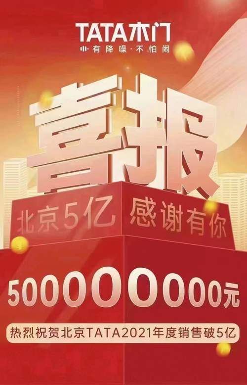 新浪家居讯 12月30日,TATA木门发布“喜报”宣布北京TATA木门2021年度销售额破5亿。TATA木门始终以“做更好的门,给更多的人用”为使命,注重产品研发设计。在2022新品发布会上,发布了主动降噪静音门,让主动降噪技术首次应用于木门行业,未来可期!
