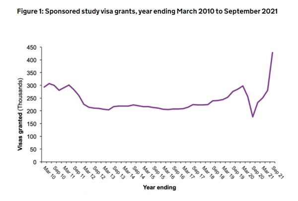 报告称,从当前数据上来看,2021年相比前一年暴增143%,比新冠疫情前增长55%,是有记录以来英国发放学生签证数最高的年度数据。