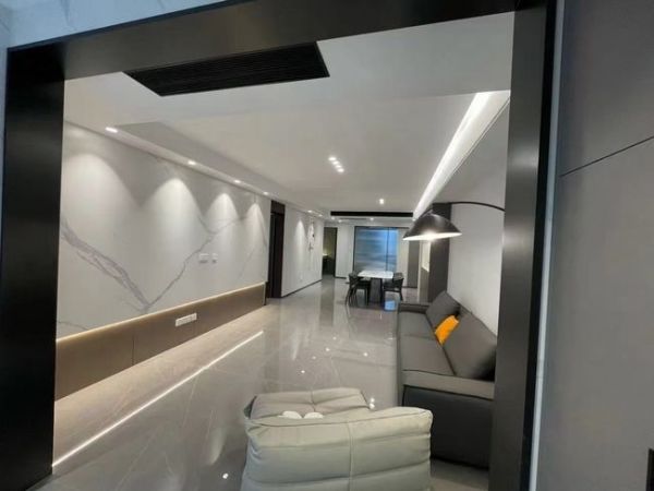 整个空间时尚大方却又不单调,艺术感十足,大理石背景墙简约又高级,其他墙面保留大白墙,后期买的装饰画到场之后作为空间点缀,再配上女业主买的绿植,平衡客厅的自然之美。