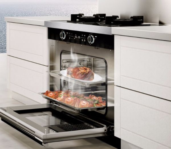 帅康自动清洗集成灶GY971的下柜是一款蒸烤一体箱,没有了嵌入的烦恼,又充分利用了橱柜空间,台上煎炒,台下蒸烤,同步进行,省事多了。